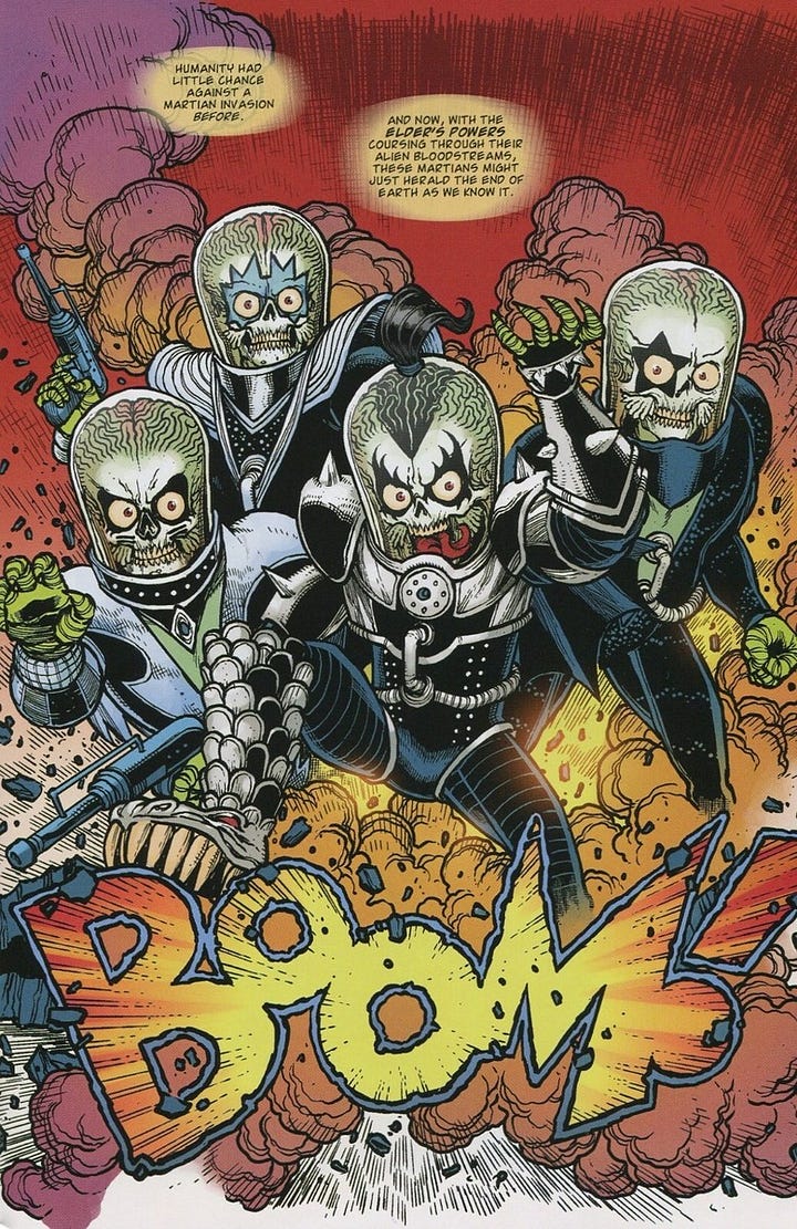 And just to turn the ridiculousness up even louder, me and my Spaceman artist Alan Robinson also once turned Ace and the others in the band into Mars Attacks martians in a comic that was pretty much a cosmic tribute to the old and much-beloved Marvel Comics KISS comic:
